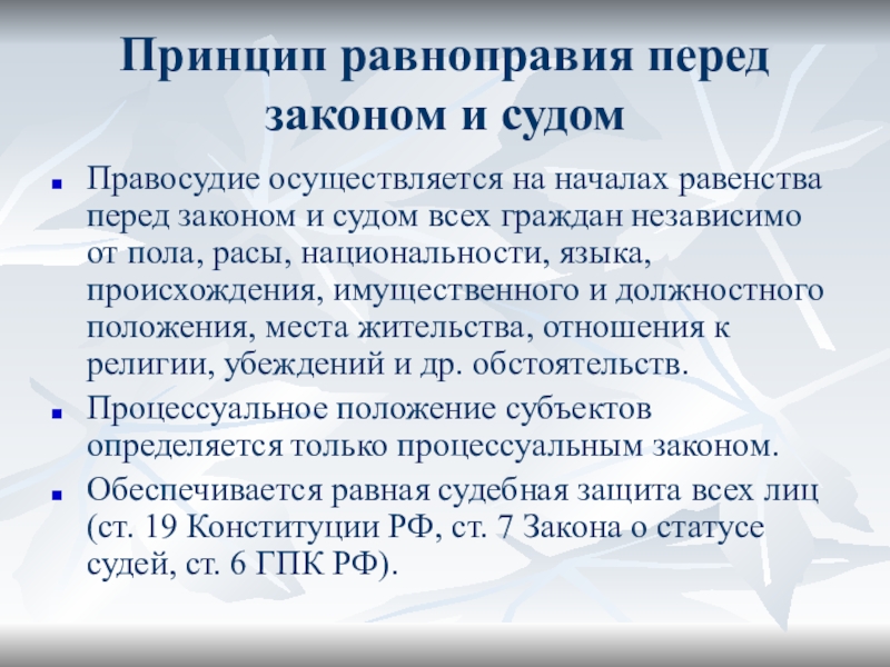 законом и судом всех граждан независимо от пола, расы, национальности, языка, происхождения, имущественного и должностного положения, места жительства, отношения к религии, убеждений и др. обстоятельств.