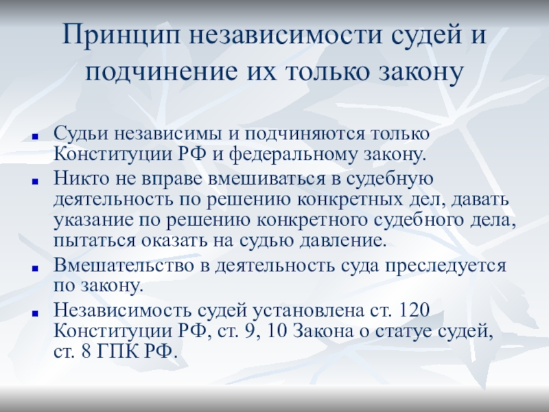Слайд 16Принцип независимости судей и подчинение их только закону
