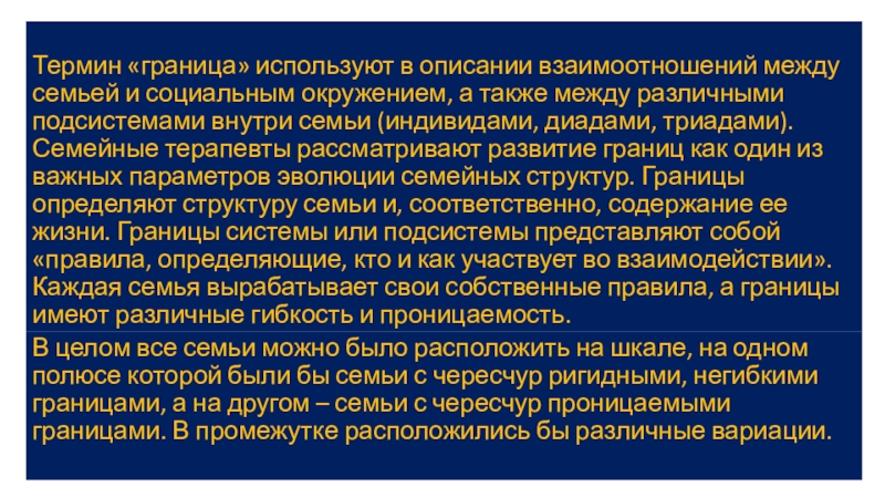 В целом все семьи можно было расположить на шкале, на одном полюсе которой были бы семьи с чересчур ригидными, негибкими границами, а на другом – семьи с чересчур проницаемыми границами. В промежутке расположились бы различные вариации.
