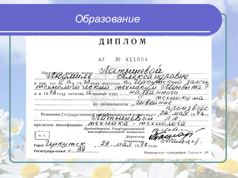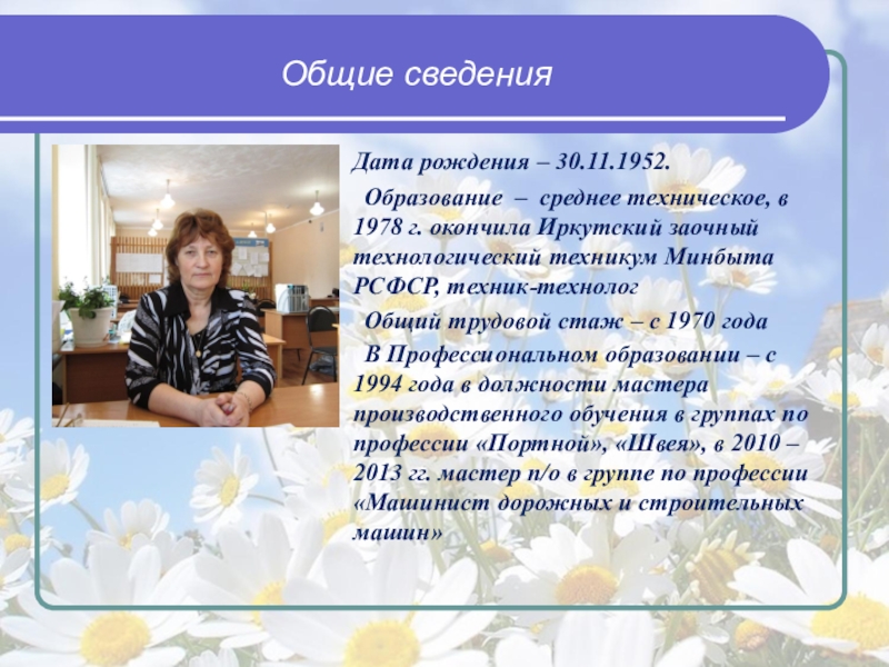 Общие сведения  Дата рождения – 30.11.1952.	Образование – среднее техническое, в 1978 г. окончила Иркутский заочный