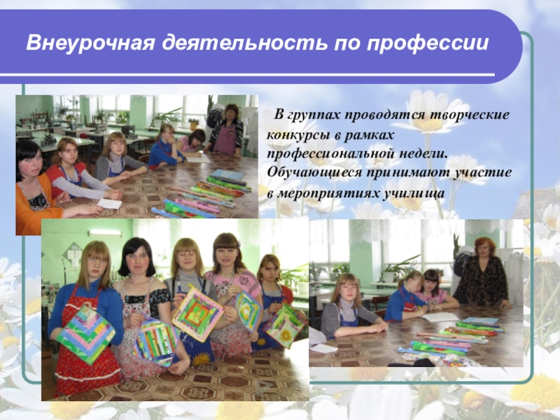 Внеурочная деятельность по профессии	В группах проводятся творческие конкурсы в рамках профессиональной недели. Обучающиеся принимают участие в мероприятиях