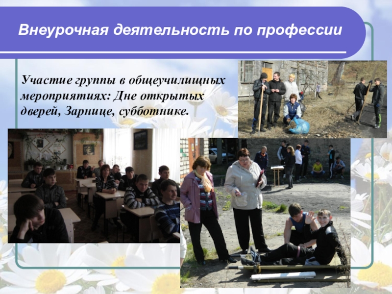 Внеурочная деятельность по профессииУчастие группы в общеучилищных мероприятиях: Дне открытых дверей, Зарнице, субботнике.