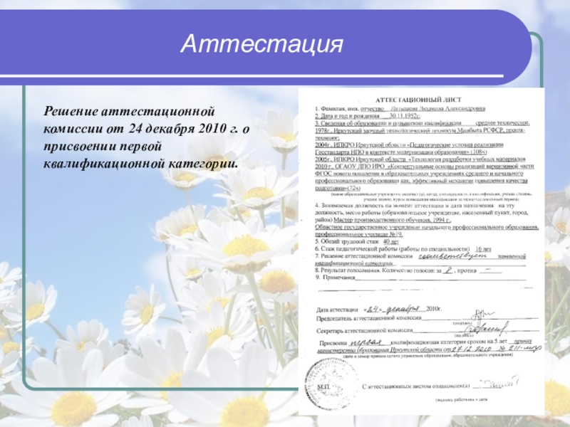 АттестацияРешение аттестационной комиссии от 24 декабря 2010 г. о присвоении первой квалификационной категории.