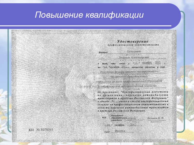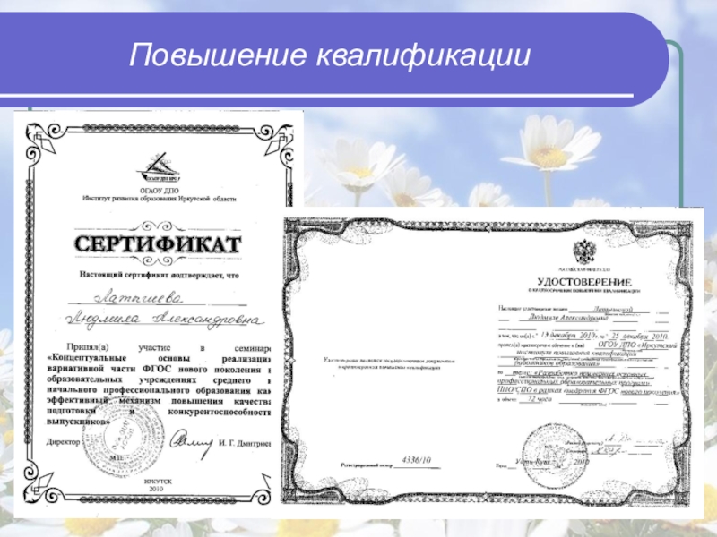 Прошла краткосрочное обучение в ОГОУ ДПО «Иркутский институт повышения квалификации работников образования» по теме: «Информационная культура педагога» в 2012 г.