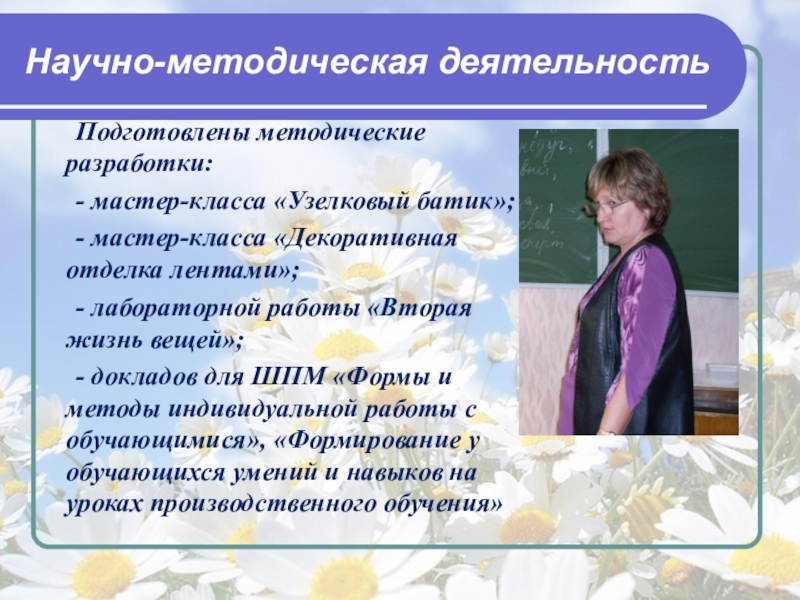 Научно-методическая деятельность	Подготовлены методические разработки:	- мастер-класса «Узелковый батик»;	- мастер-класса «Декоративная отделка лентами»;	- лабораторной работы «Вторая жизнь вещей»;	- докладов