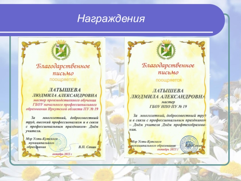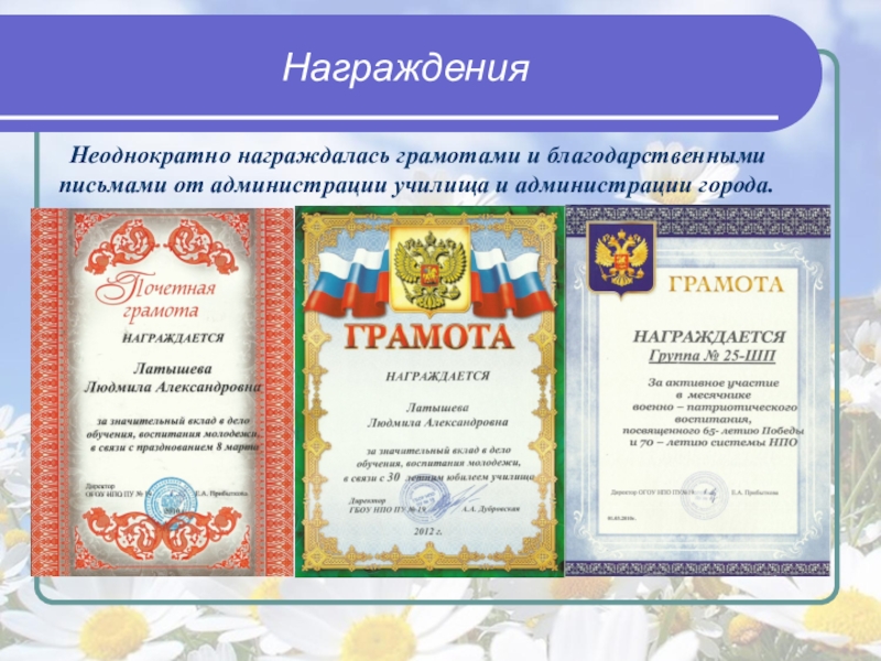 Неоднократно награждалась грамотами и благодарственными письмами от администрации училища и
