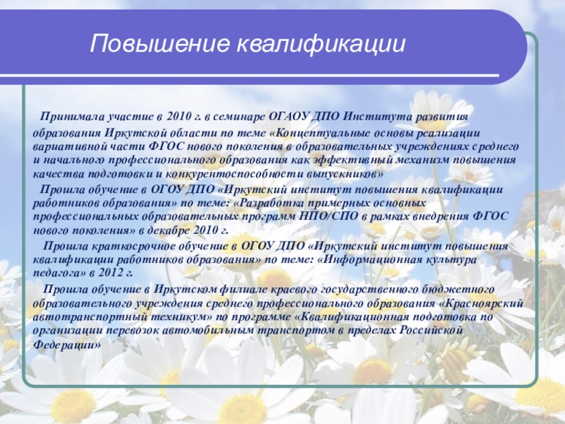 Прошла обучение в ОГОУ ДПО «Иркутский институт повышения квалификации работников образования» по теме: «Разработка примерных основных профессиональных образовательных программ НПО/СПО в рамках внедрения ФГОС нового поколения» в декабре 2010 г.