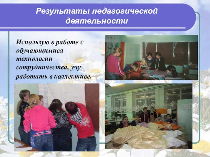 Результаты педагогической деятельностиИспользую в работе с обучающимися технологии сотрудничества, учу работать в коллективе.