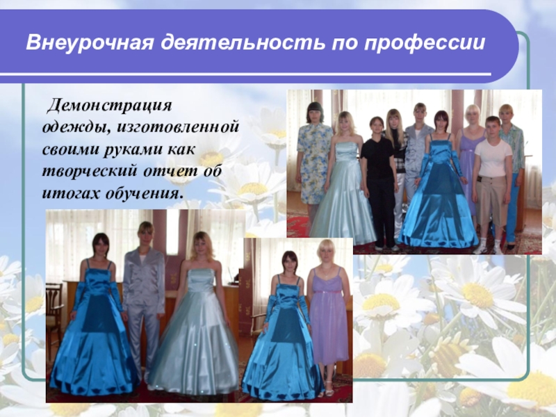 Внеурочная деятельность по профессии	Демонстрация одежды, изготовленной своими руками как творческий отчет об итогах обучения.