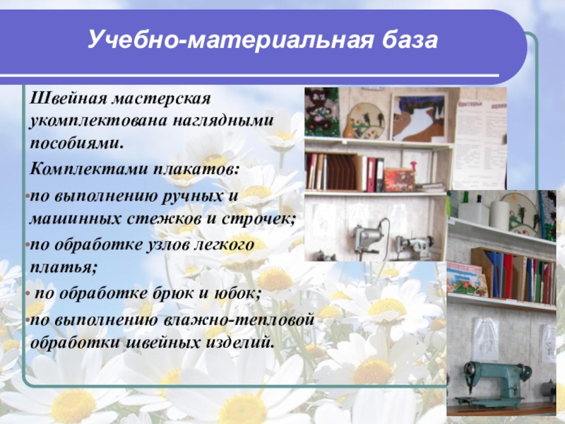 Учебно-материальная базаШвейная мастерская укомплектована наглядными пособиями.Комплектами плакатов:по выполнению ручных и машинных стежков и строчек;по обработке узлов легкого