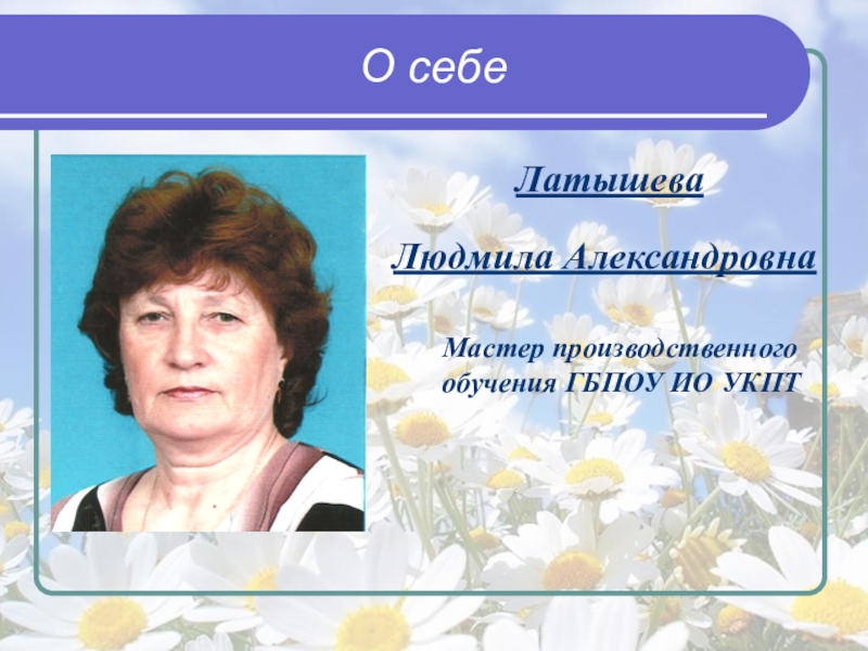 О себе Латышева Людмила Александровна Мастер производственного обучения ГБПОУ ИО УКПТ