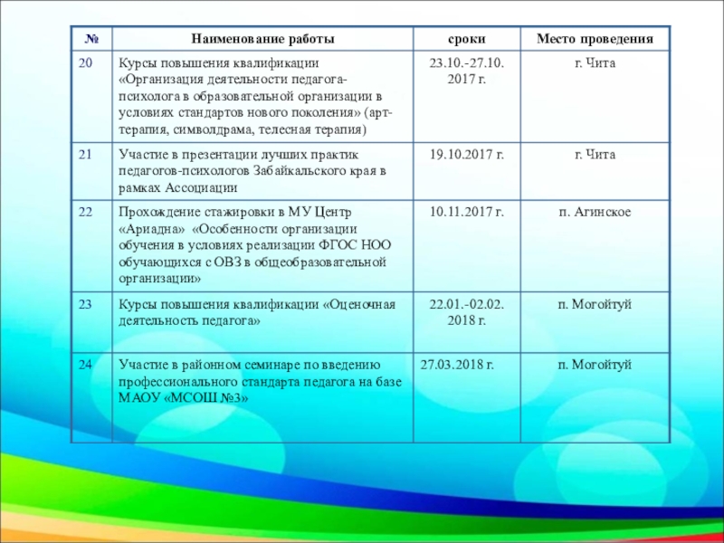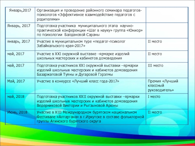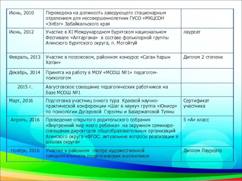 Окончив заочно институт, волей случая я оказалась в Могойтуйской школе №1 и стала педагогом-психологом. Рядом оказались коллеги, которые помогли мне понять, что школа - моя семья, мой дом, моя жизнь. Моим другом, учителем и наставником стала Гуруева Сэмжэдма Мункоевна, которая помогла мне преодолеть трудности в освоении данной профессии.