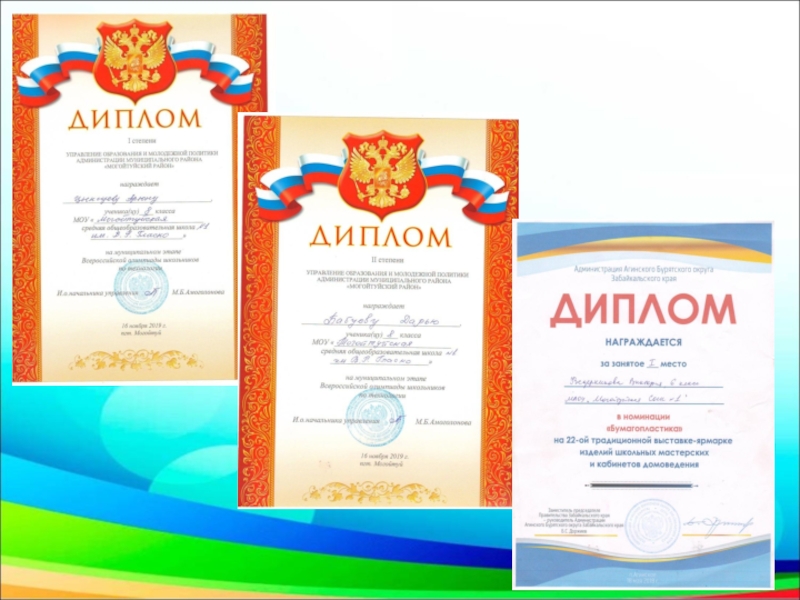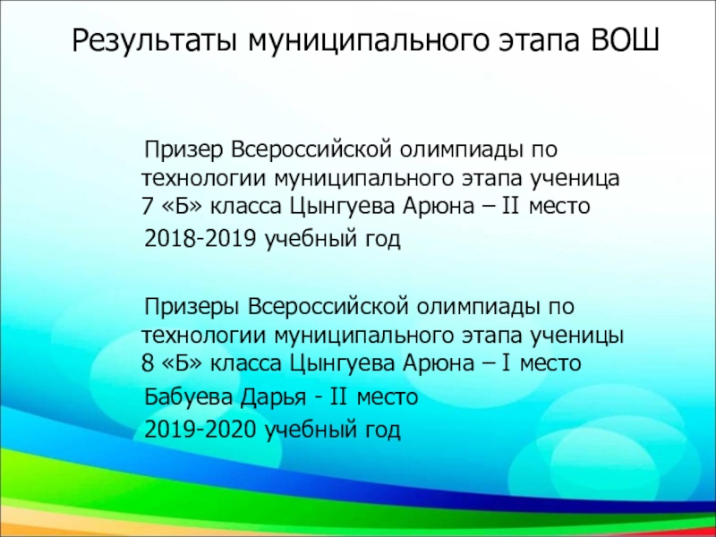 Призеры Всероссийской олимпиады по технологии муниципального этапа ученицы 8 «Б» класса Цынгуева Арюна – I место