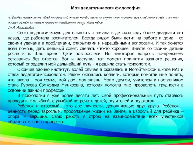 стремится познать через неё самого себя, и именно таким путём он может принести наибольшую пользу обществу» Ш.А. Амонашвили