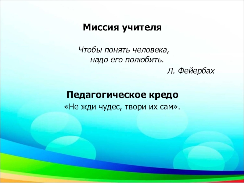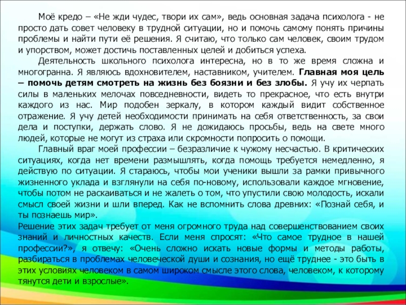 Слайд 7 Моё кредо – «Не жди чудес, твори их сам», ведь основная