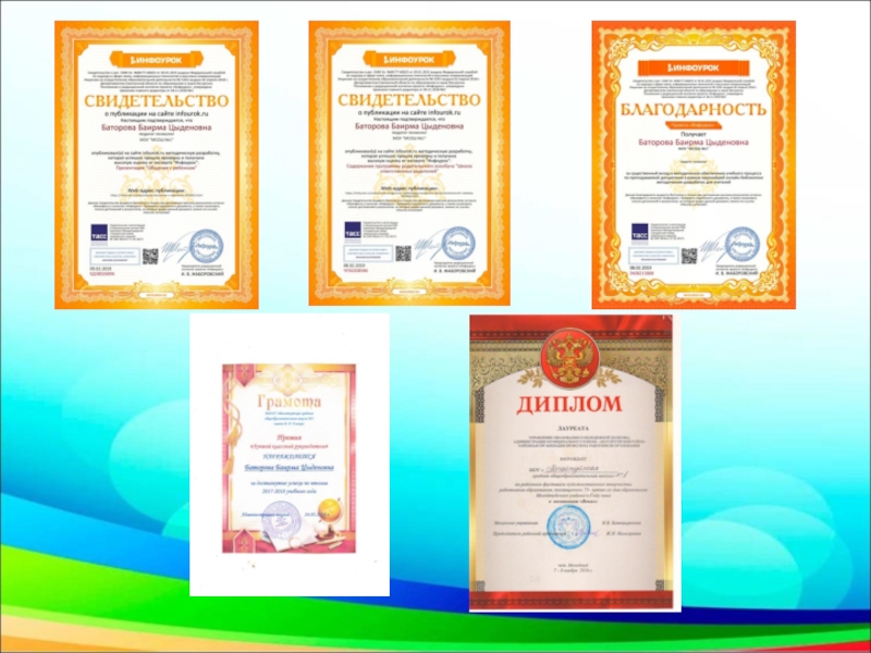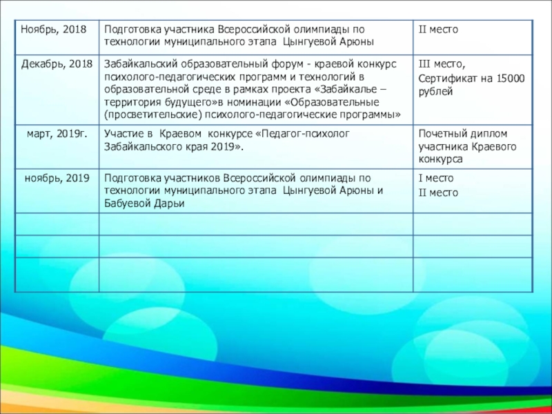 Так появились первые, пока ещё незначительные результаты. Их не было бы, если бы со мной не работали мои коллеги, не было бы тех детей, которые помогали мне осваивать азы моей профессии, не было бы родителей-единомышленников. Поэтому всем моим коллегам хочется сказать большое спасибо!