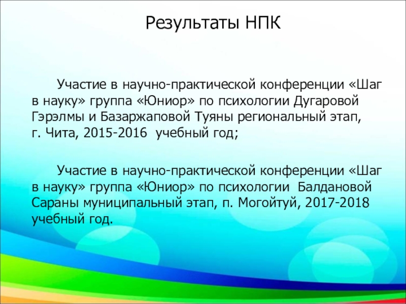 Участие в научно-практической конференции «Шаг в науку» группа «Юниор» по психологии Балдановой Сараны муниципальный этап, п. Могойтуй, 2017-2018 учебный год.