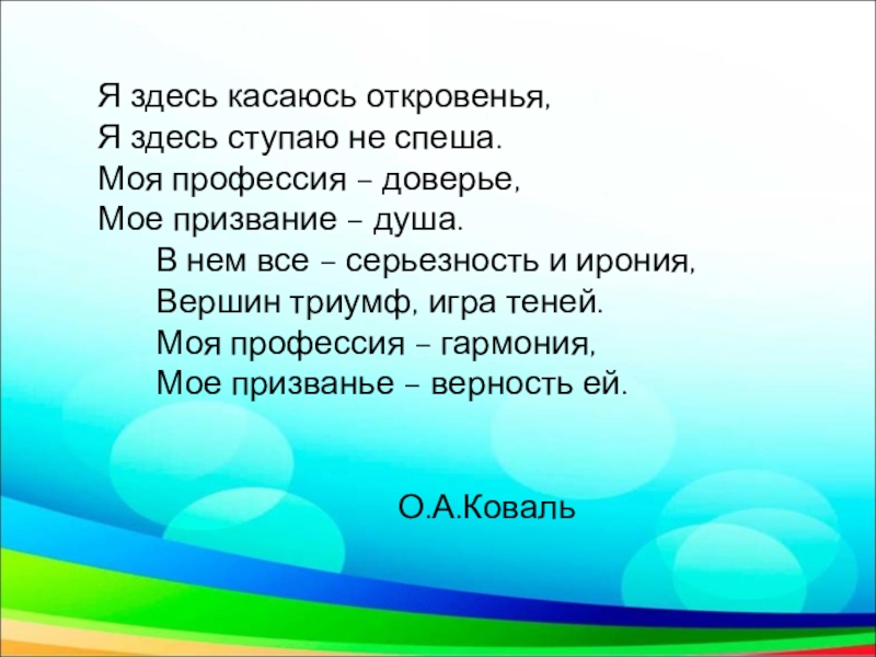 Деятельность школьного психолога интересна, но в то же время сложна и многогранна. Я являюсь вдохновителем, наставником, учителем. Главная моя цель – помочь детям смотреть на жизнь без боязни и без злобы. Я учу их черпать силы в маленьких мелочах повседневности, видеть то прекрасное, что есть внутри каждого из нас. Мир подобен зеркалу, в котором каждый видит собственное отражение. Я учу детей необходимости принимать на себя ответственность, за свои дела и поступки, держать слово. Я не дожидаюсь просьбы, ведь на свете много людей, которые не могут из страха или скромности попросить о помощи.