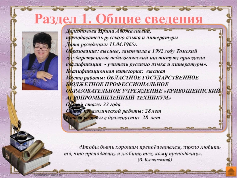 Место работы: ОБЛАСТНОЕ ГОСУДАРСТВЕННОЕ БЮДЖЕТНОЕ ПРОФЕССИОНАЛЬНОЕ ОБРАЗОВАТЕЛЬНОЕ УЧРЕЖДЕНИЕ «КРИВОШЕИНСКИЙ АГРОПРОМЫШЛЕННЫЙ ТЕХНИКУМ»