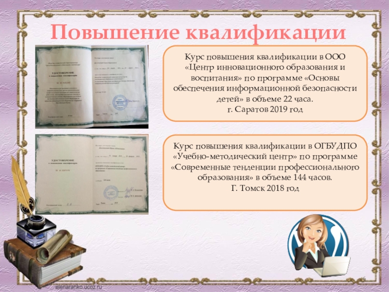 Курс повышения квалификации в ОГБУДПО «Учебно-методический центр» по программе «Современные тенденции профессионального образования» в объеме 144 часов.