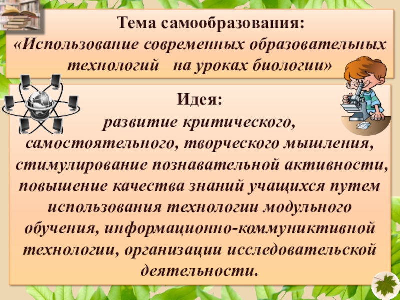 повышение качества знаний учащихся путем использования технологии модульного обучения, информационно-коммуниктивной технологии, организации исследовательской деятельности.