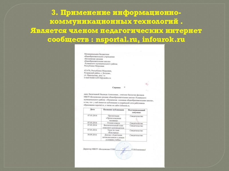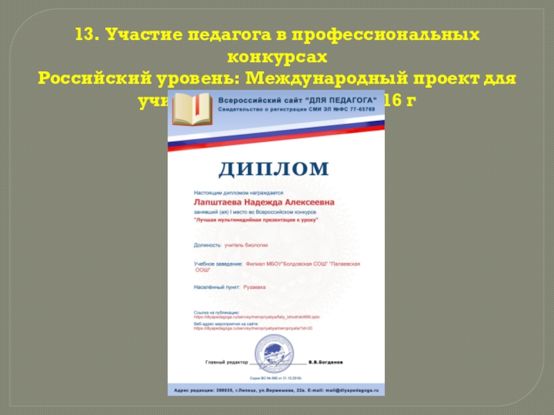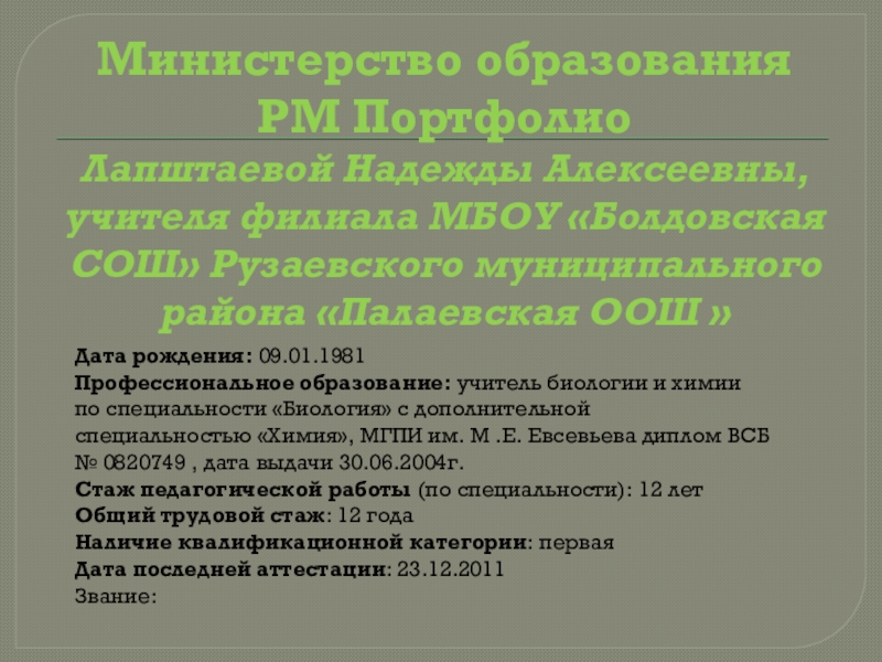 Профессиональное образование: учитель биологии и химии по специальности «Биология» с дополнительной специальностью «Химия», МГПИ им. М .Е. Евсевьева диплом ВСБ № 0820749 , дата выдачи 30.06.2004г.