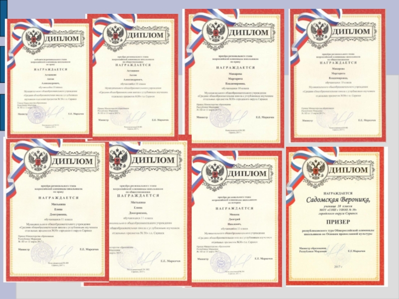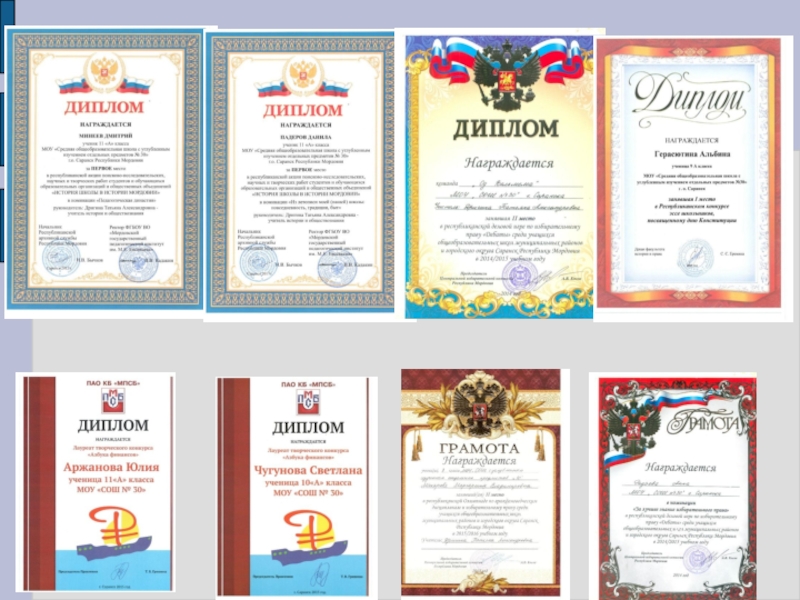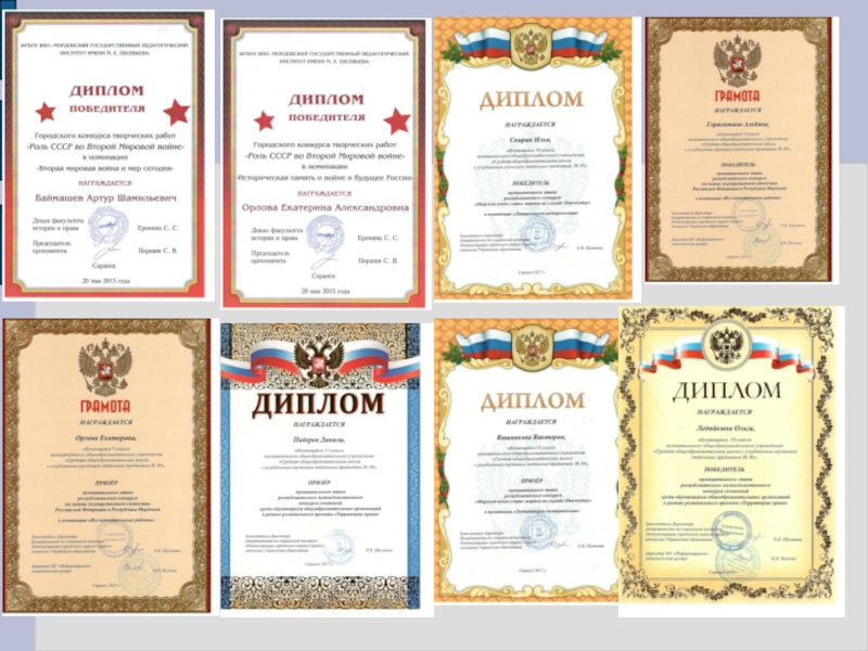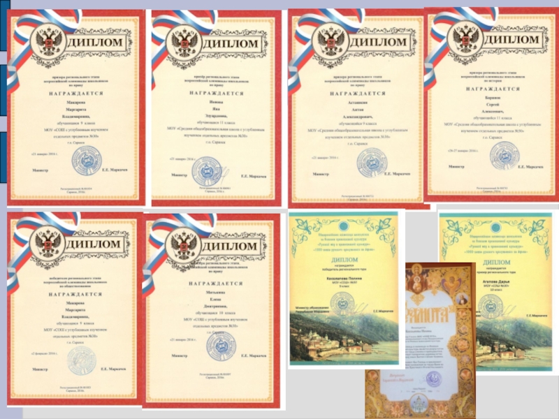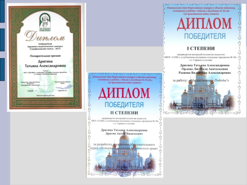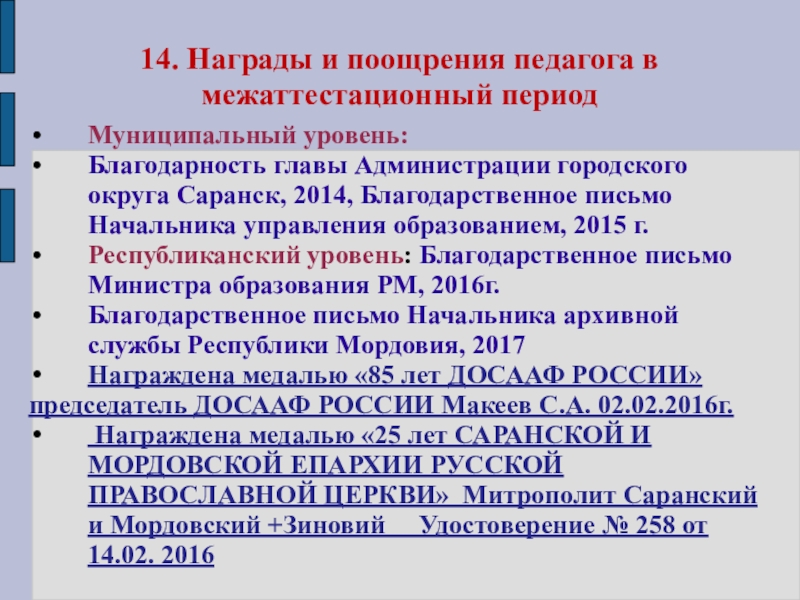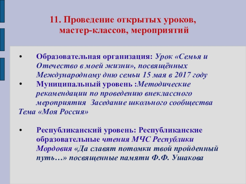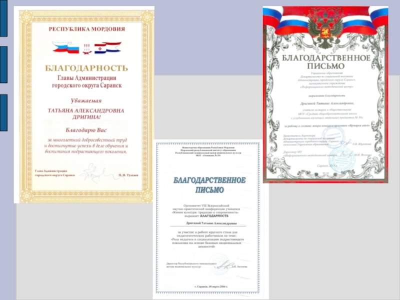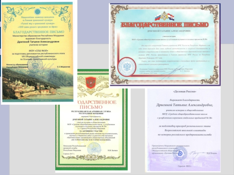 Республиканский уровень: член жюри республиканских конкурсов «История школы в истории Мордовии» и «Юный архивист», год 2016, 2017.