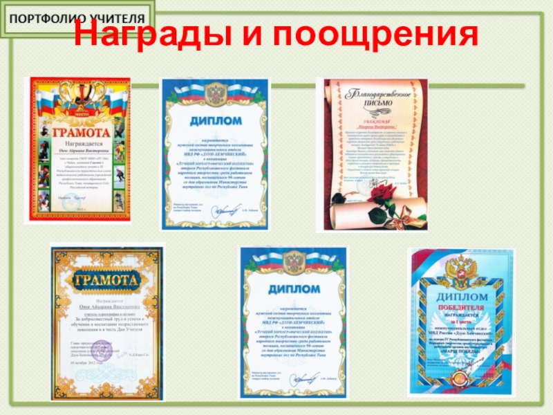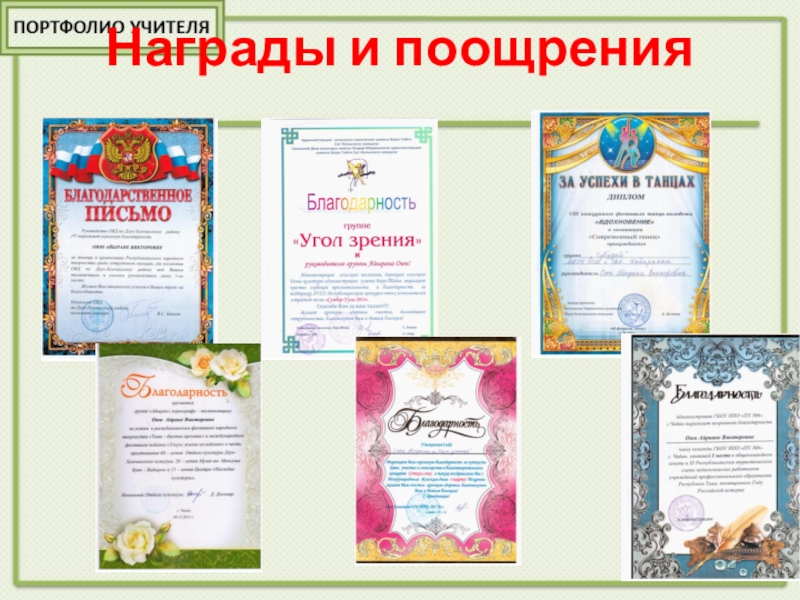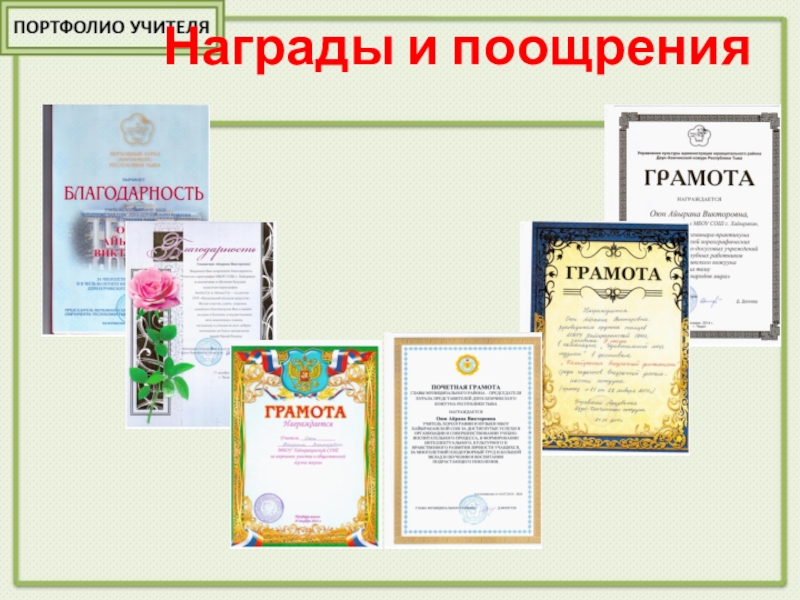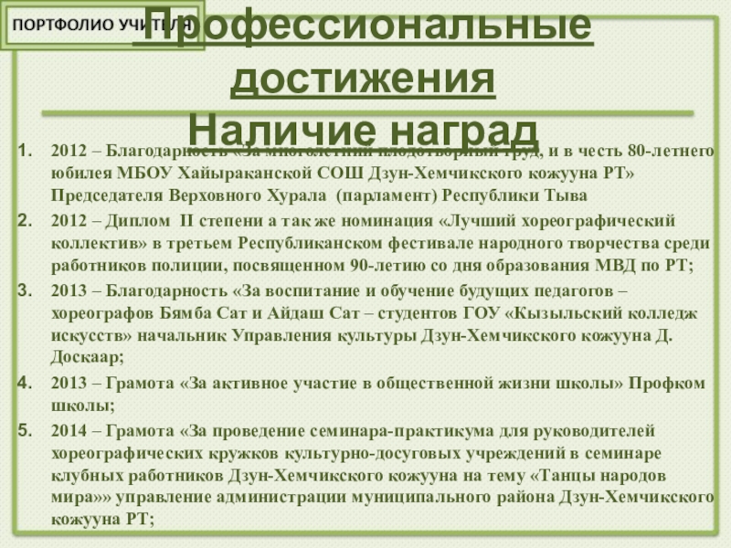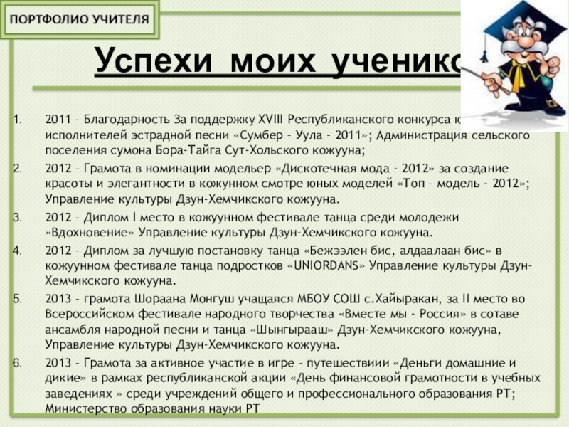 2013 – Грамота III место в кожуунном конкурсе «На балу у Дюймовочки» среди учащихся 1-4 классов; ДТД г.Чадана