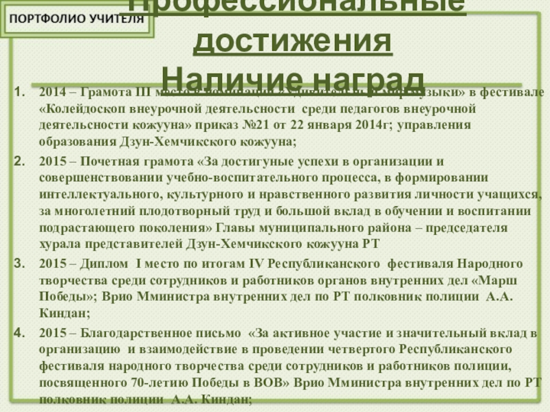 2015 – Грамота в номинации «Лучшая композиция программы» на фестивале детско-юношеского творчества «Салют Победы» посвященном 70-летию Победы войне 1941 – 1945 годов среди учащихся образовательных учреждений Дзун-Хемчикского кожууна; Управления образования приказ № 156 от 22 марта 2015года.