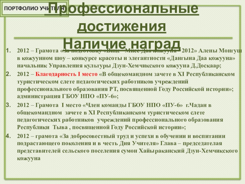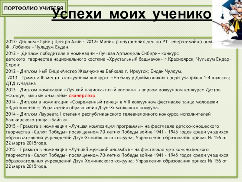 2012 - Диплом победителя в номинации «Лучшая Артмодель Сибири» конкурс детского творчества национального костюиа «Хрустальный башмачок» г.Красноярск; Чульдум Ендар-Серен;