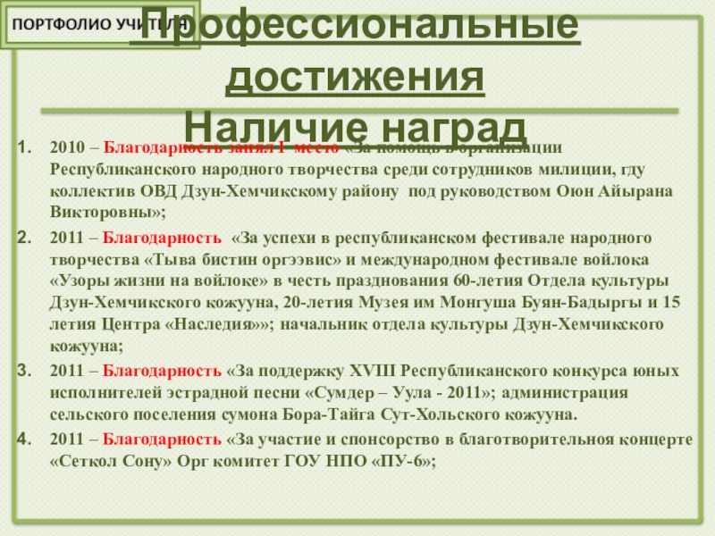 2013 – Диплом номинации «Лучший национальный костюм» в первом кожуунном конкурсе Дуэтов «Оолдун, кыстын онзагайы» сканерлээр