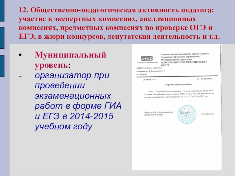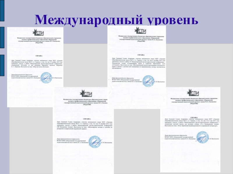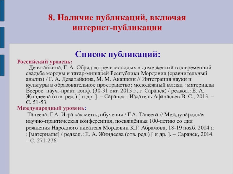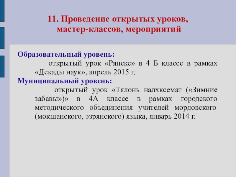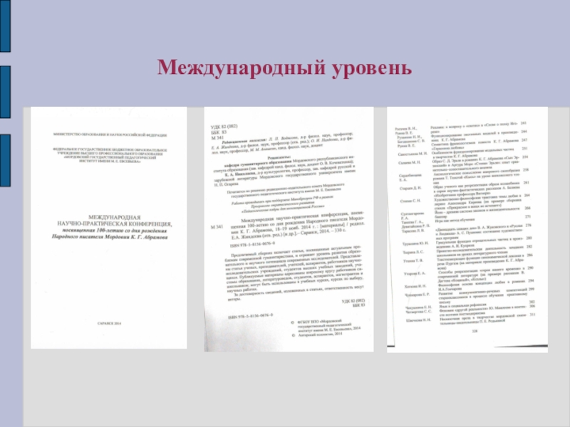 - выступление «Игра как метод обучения» на Международной научно-практической конференции, посвященной 100-летию со дня рождения Народного писателя Мордовии К. Г. Абрамова, 19 ноября 2014 года,