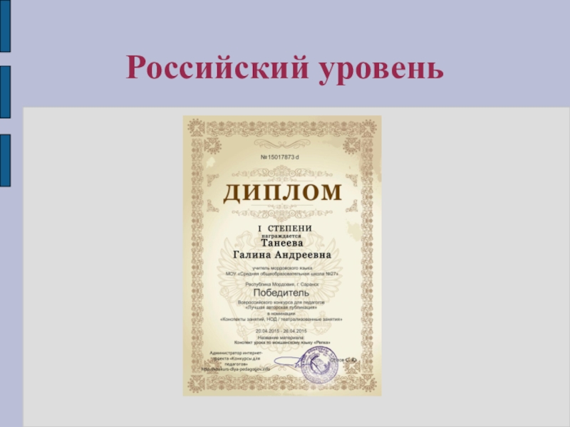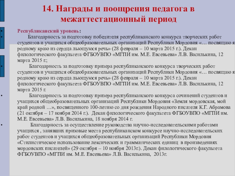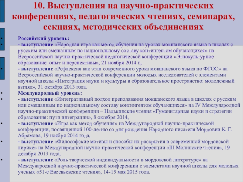 - выступление «Интегративный подход преподавания мокшанского языка в школах с русским или смешанным по национальному составу контингентом обучающихся» на IV Международной научно-практической конференции – Надькинские чтения «Гуманитарные науки и стратегии образования: пути интеграции», 8 октября 2014,