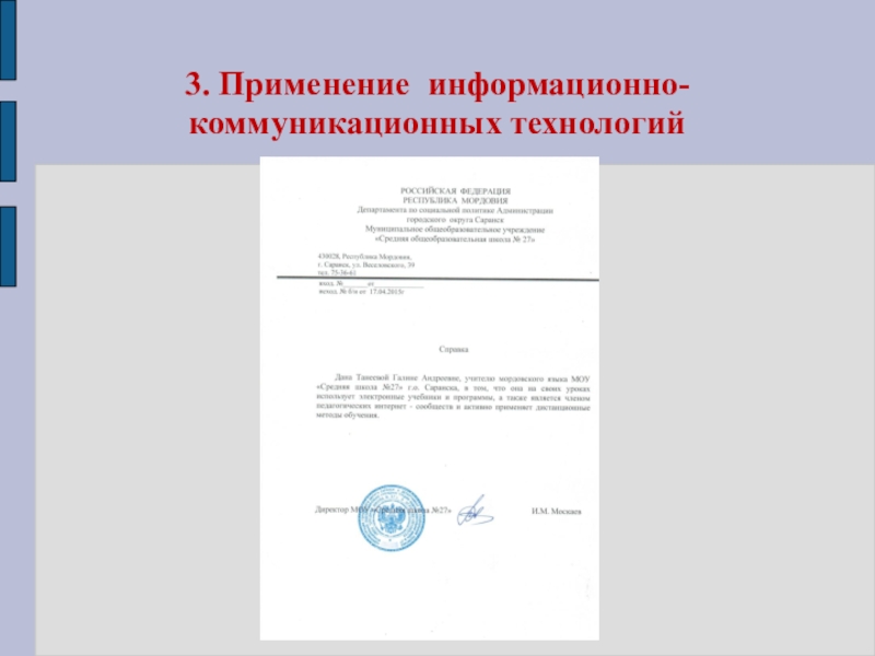 - выступление «Рефлексия как этап современного урока мокшанского языка по ФГОС» на Всероссийской научно-практической конференции молодых исследователей с элементами научной школы «Интеграция науки и культуры в образовательное пространство: молодежный взгляд», 31 октября 2013 года.