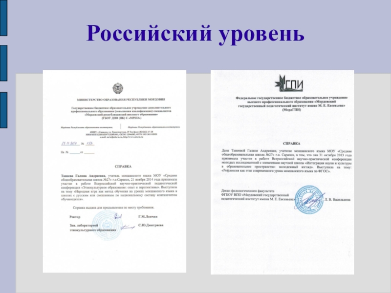 - выступление «Народная игра как метод обучения на уроках мокшанского языка в школах с русским или смешанным по национальному составу контингентом обучающихся» на Всероссийской научно-практической педагогической конференции «Этнокультурное образование: опыт и перспективы», 21 ноября 2014 г.,