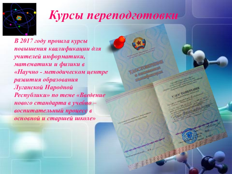 информатики,математики и физики в «Научно - методическом центре развития образования Луганской Народной Республики» по теме «Введение нового стандарта в учебно – воспитательный процесс в основной и старшей школе»