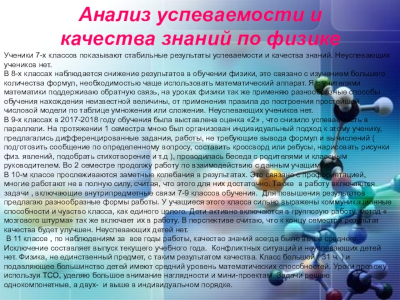 В 8-х классах наблюдается снижение результатов в обучении физики, это связано с изучением большего количества формул, необходимостью чаще использовать математический аппарат. Я с учителями математики поддерживаю обратную связь, на уроках физики так же применяю разнообразные способы обучения нахождения неизвестной величины, от применения правила до построения простейшей числовой модели по таблице умножения или сложения. Неуспевающих учеников нет.