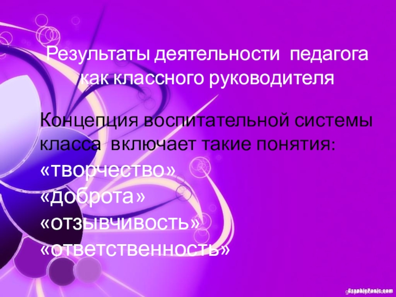 Результаты деятельности педагога как классного руководителяКонцепция воспитательной системы класса включает такие понятия:«творчество»«доброта»«отзывчивость»«ответственность»