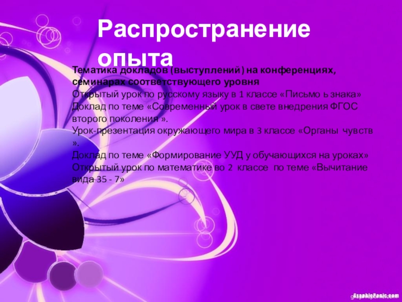 Распространение опытаТематика докладов (выступлений) на конференциях, семинарах соответствующего уровняОткрытый урок по русскому языку в 1 классе «Письмо