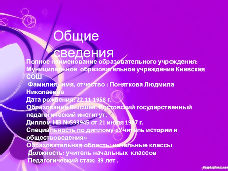 Общие сведенияПолное наименование образовательного учреждения:Муниципальное образовательное учреждение Киевская СОШ Фамилия, имя, отчество : Поняткова Людмила НиколаевнаДата рождения: