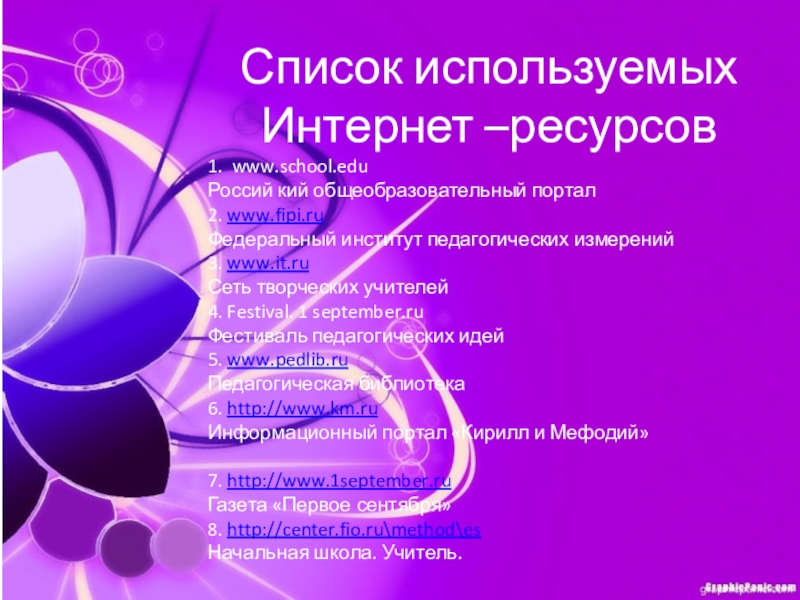 Повышение квалификацииСписок используемых Интернет –ресурсов1. www.school.eduРоссий кий общеобразовательный портал2. www.fipi.ruФедеральный институт педагогических измерений3. www.it.ruСеть творческих учителей4. Festival.
