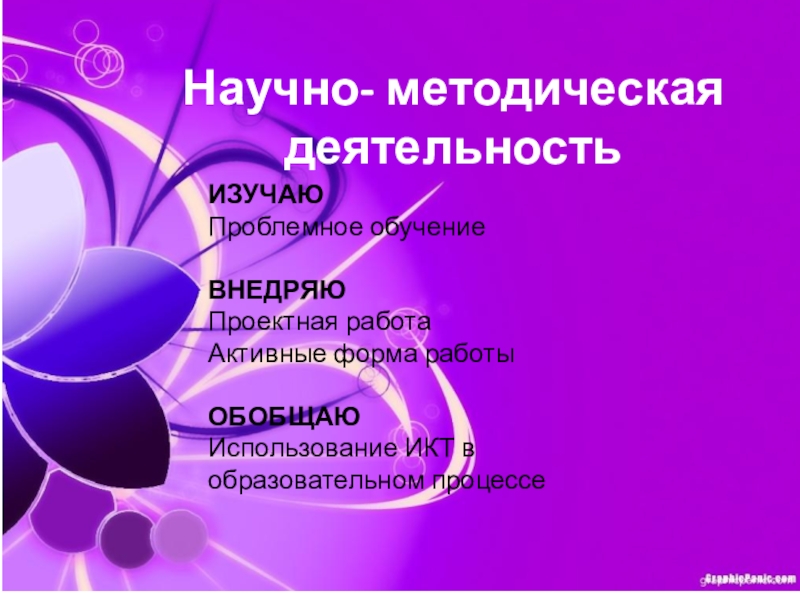 Научно- методическая деятельностьИЗУЧАЮПроблемное обучениеВНЕДРЯЮПроектная работа Активные форма работыОБОБЩАЮИспользование ИКТ в образовательном процессе