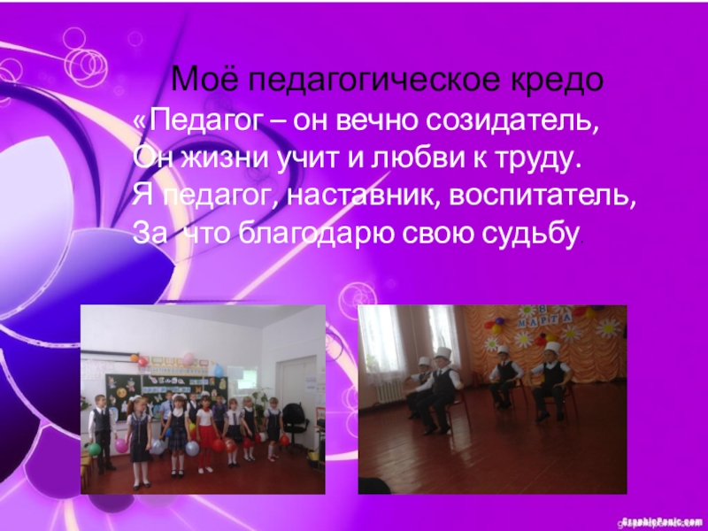 Моё педагогическое кредо«Педагог – он вечно созидатель,Он жизни учит и любви к труду.Я педагог, наставник, воспитатель,За что