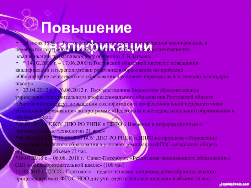 Повышение квалификации24 июня 1994 г. Ростовский областной институт повышения квалификации и переподготовки работников образования. Проблемные курсы повышения