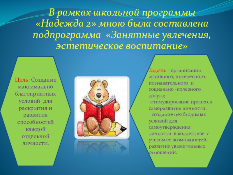 Цель: Создание максимально благоприятных условий для раскрытия и развития способностей каждой отдельной личности.