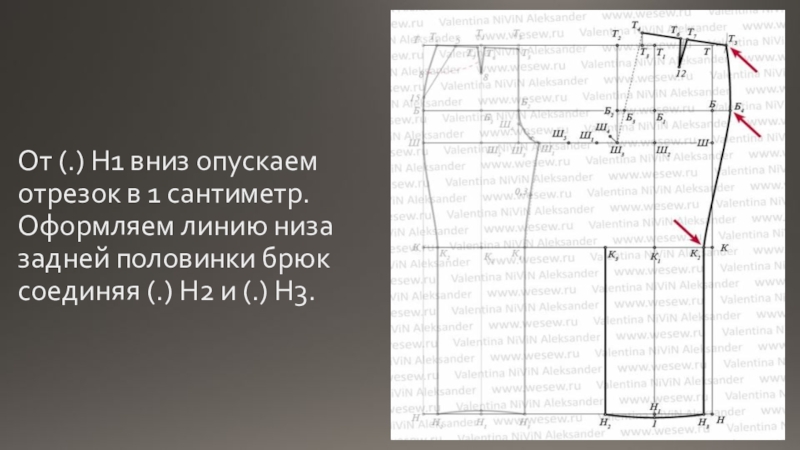 и плавной выгнутой линией оформляем линию низа передней половинки брюк соединяя (.) Н2 и (.) Н3.