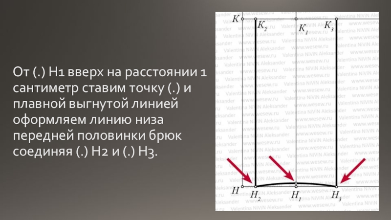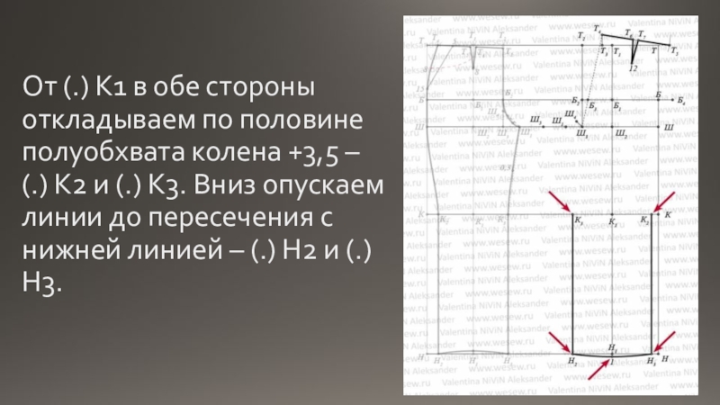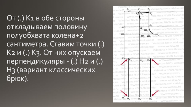Ставим точки (.) К2 и (.) К3. От них опускаем перпендикуляры - (.) Н2 и (.) Н3 (вариант классических брюк).