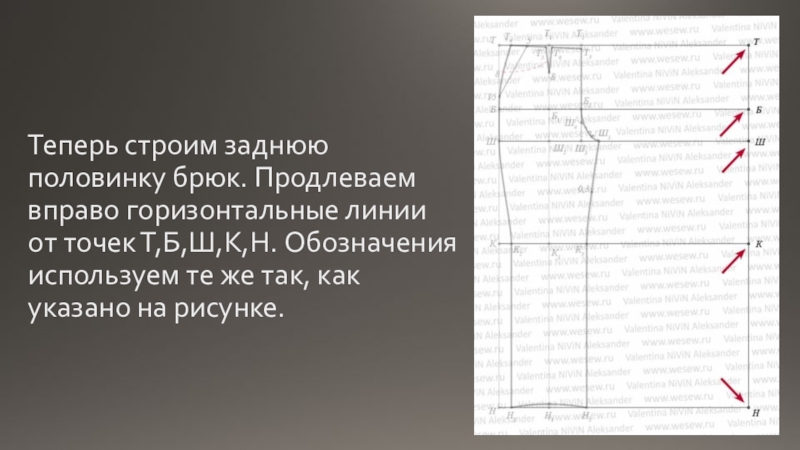 Слайд 20Теперь строим заднюю половинку брюк. Продлеваем вправо горизонтальные линии от точек