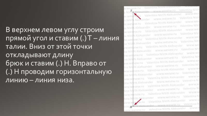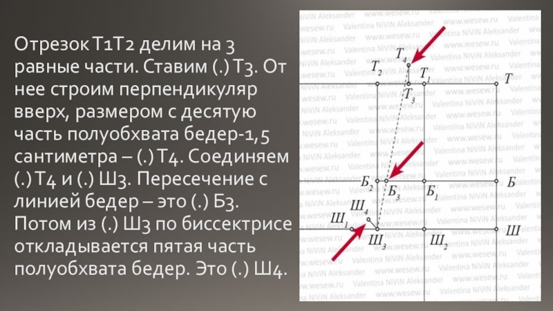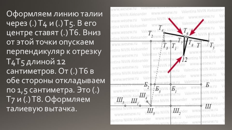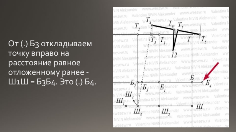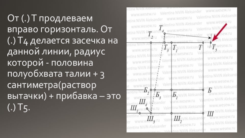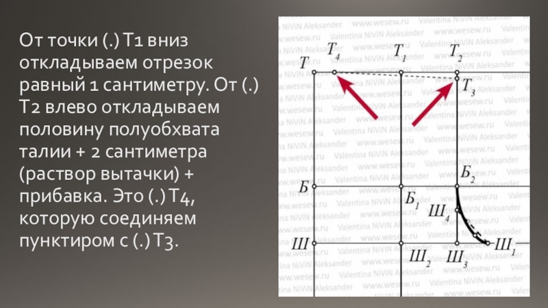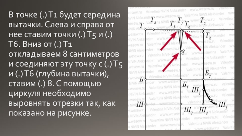 Слайд 13В точке (.) Т1 будет середина вытачки. Слева и справа от