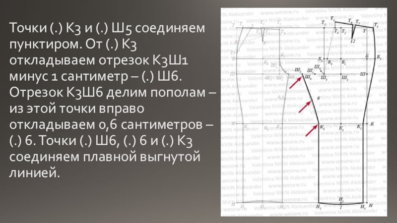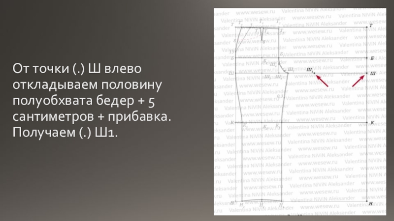 Слайд 21От точки (.) Ш влево откладываем половину полуобхвата бедер + 5